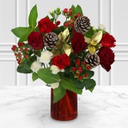The Crimson Frost bouquet combining frosty white carnations, vibrant red roses, and snowy pinecones. Golden ruscus and red hypericum bring depth and warmth to this arrangement, capturing the classic festive palette with a rustic twist.